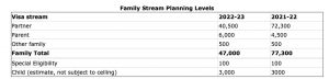 طبق اسناد بودجه، ویزای همسر و فرزند به ترتیب 40500 و 3000 ویزا برآورد شده است. در حالی که 6000 مکان برای ویزای والدین در دسترس خواهد بود و 500 مکان برای سایر ویزاهای خانوادگی.